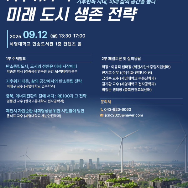 2025 친환경에너지페스티벌 학술행사가 '기후위기 속 미래 도시 생존 전략'이라는 주제로 오는 9월 12일 금요일, 세명대..