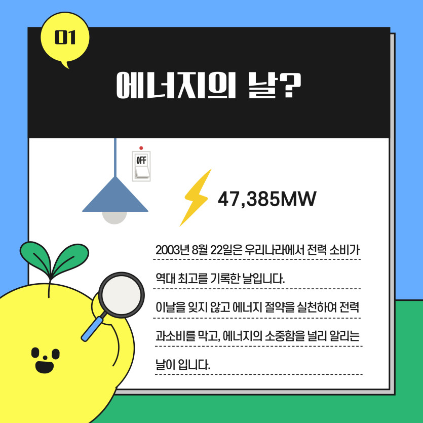 매년 8월 22일은 에너지의 날입니다. 2003년 8월 22일, 그해 최고 전력소비가 역대 최고치를 찍었고, 이 날을 잊지 않고 에너지를 절약하기 위해 만들어진 날입니다.