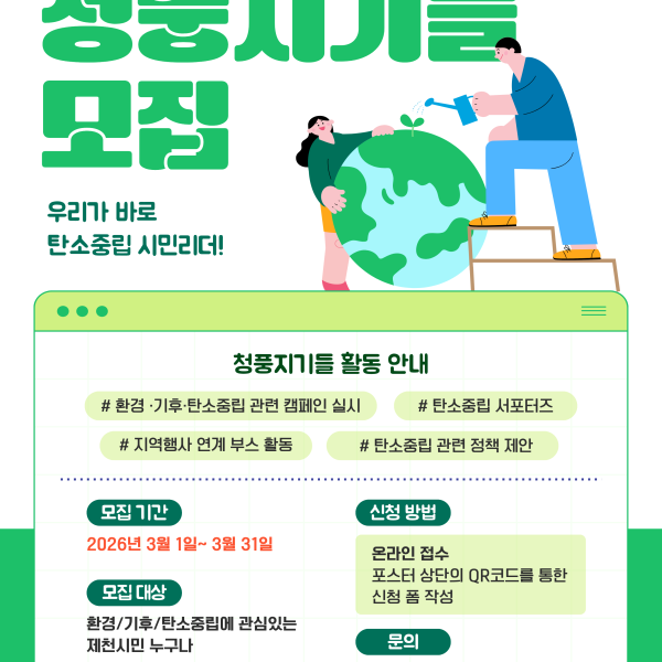 제천시 탄소중립 실천을 함께 만들어갈 청풍지기들 2기를 모집합니다. 기후위기 대응과 탄소중립 실천을 위해 다양한 활동에 ..