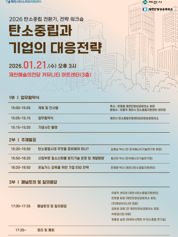 2026년제천시 탄소중립과 기업의 대응전략 워크숍이 오는 1월 12일 수요일, 제천예술의전당 커뮤니티 아트센터에서 개최됩니..