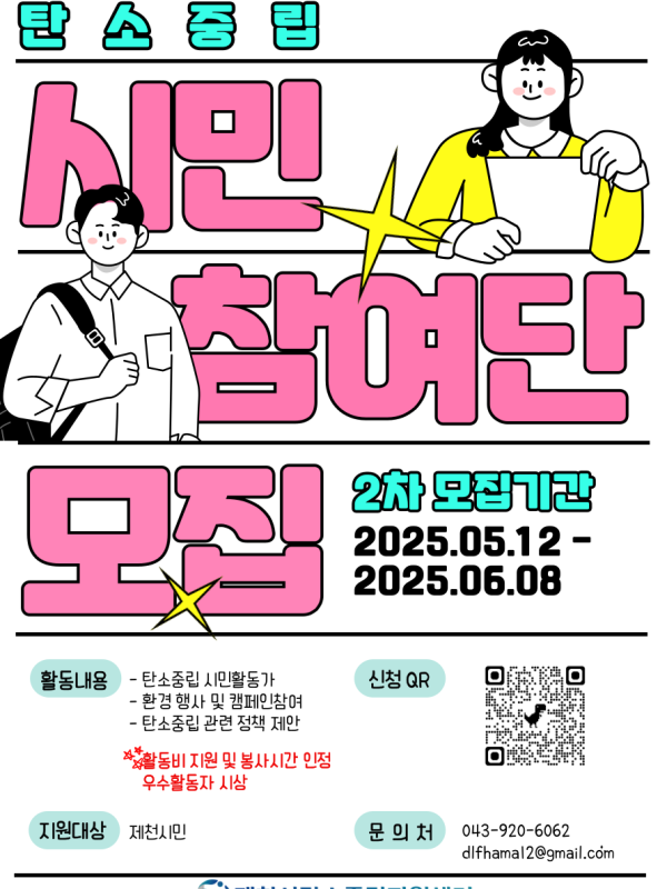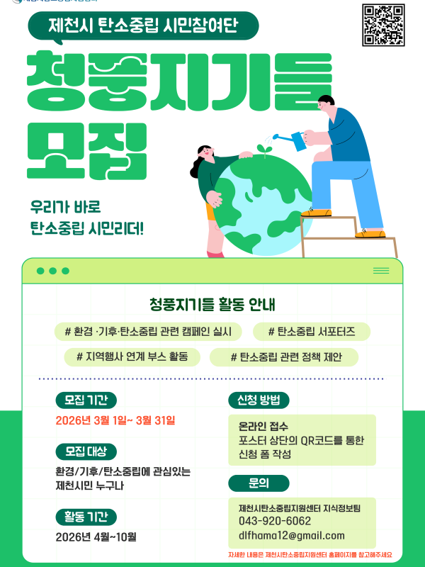제천시 탄소중립 실천을 함께 만들어갈 청풍지기들 2기를 모집합니다. 기후위기 대응과 탄소중립 실천을 위해 다양한 활동에 ..