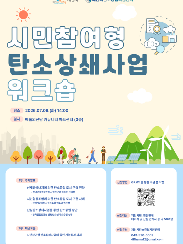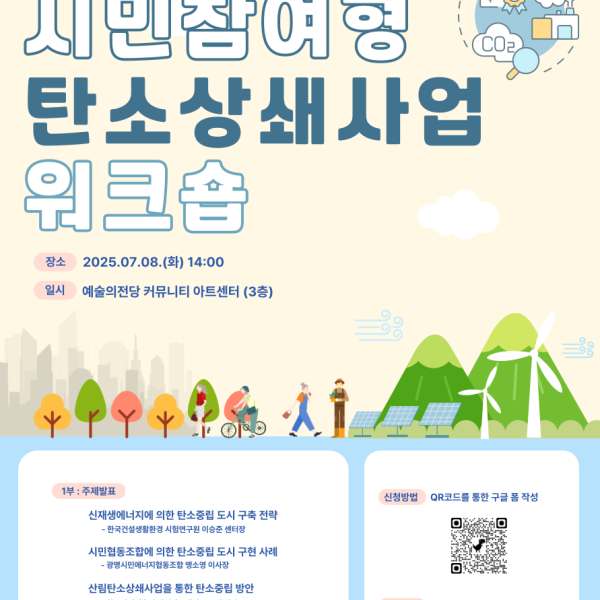 '시민참여형 탄소상쇄사업 워크숍'이 개최됩니다 탄소중립 도시 구현과 탄소상쇄사업을 통한 탄소중립을 주제로 외부 초청 강사..