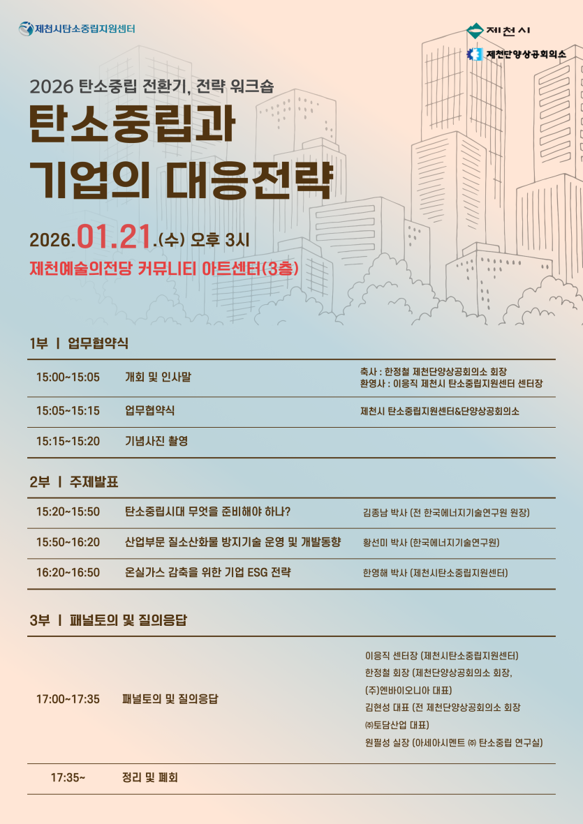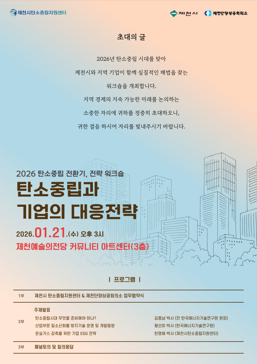 2026년제천시 탄소중립과 기업의 대응전략 워크숍이 오는 1월 12일 수요일, 제천예술의전당 커뮤니티 아트센터에서 개최됩니다.