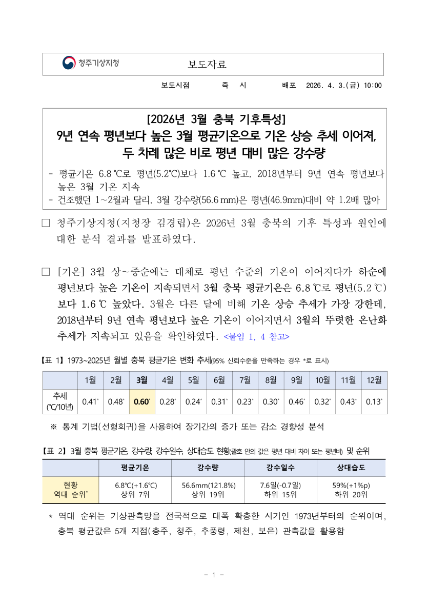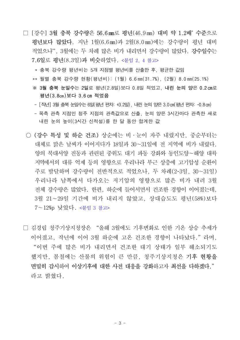 청주기상청에서 작성한 2026년 3월 충북 기후특성 중 일부를 발췌하였습니다.